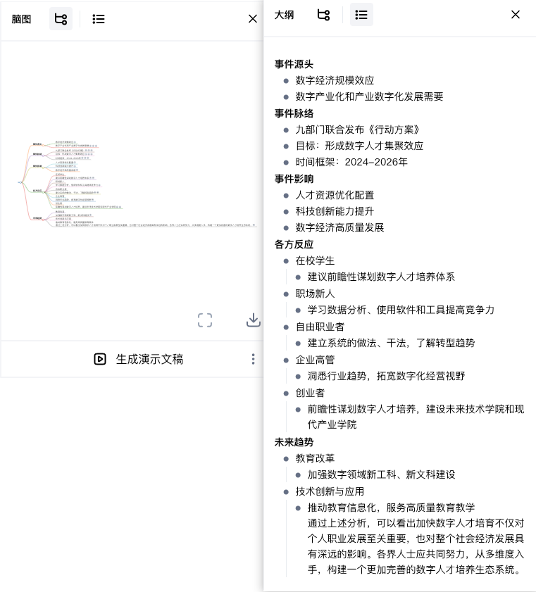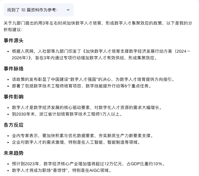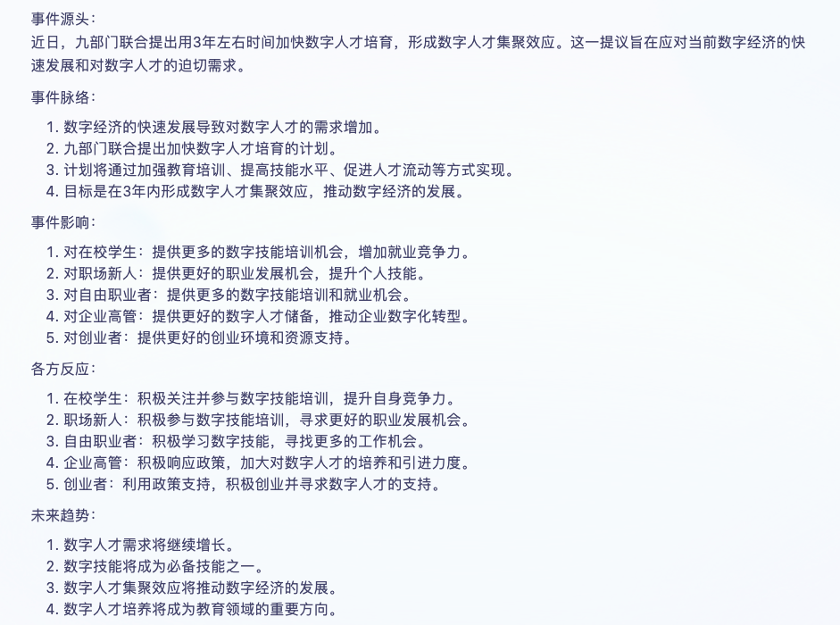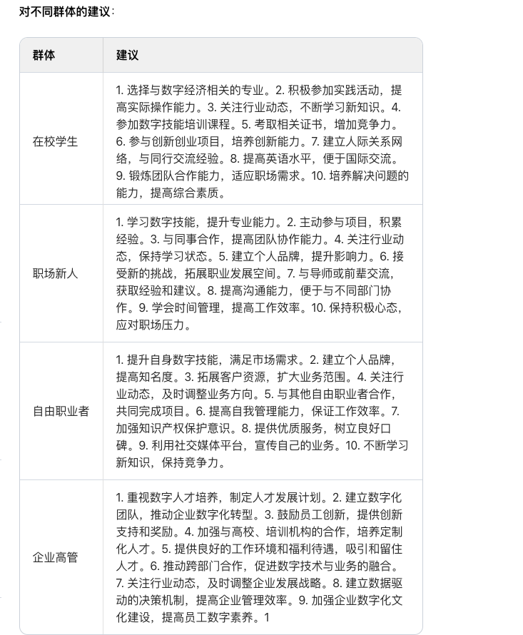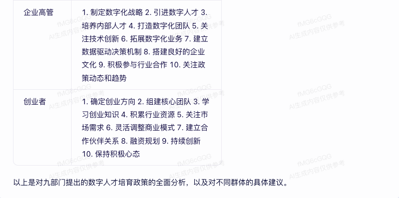 提示词:近日,九部门提出:用3年左右时间,加快数字人才培育,形成数字人才集聚效应,你怎么看?请从事件源头、事件脉络、事件影响、各方反应、未来趋势几方面进行阐述,并对在校学生、职场新人、自由职业者、企业高管、创业者等不同群体分别提出10点建议,最后用表格总结呈现以上内容。