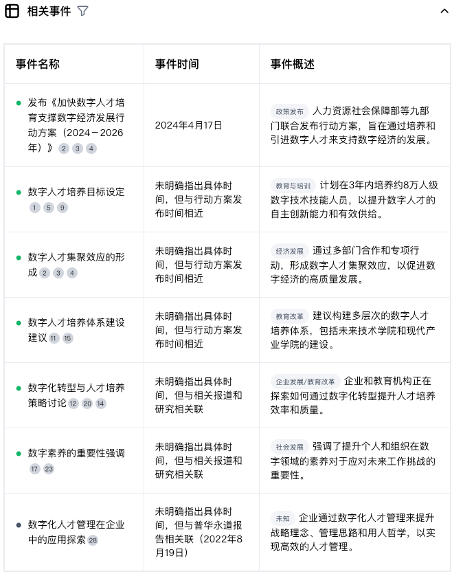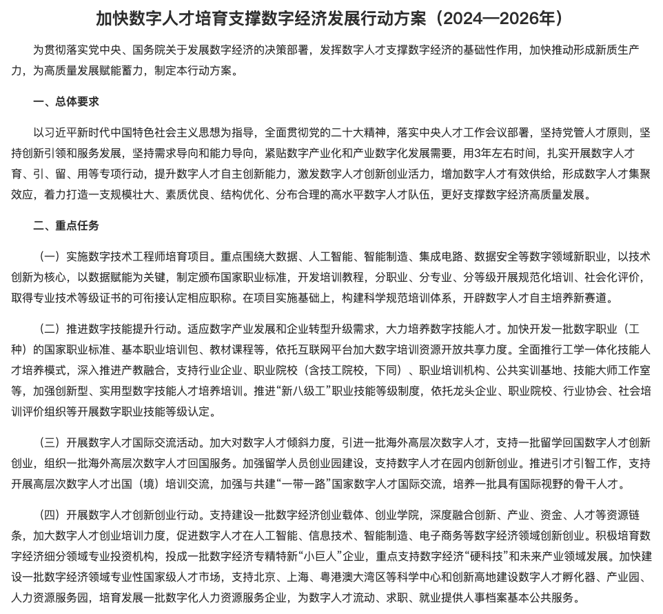 2024 年 4 月 17 日,人社部等九部门发布了《加快数字人才培育支撑数字经济发展行动方案(2024-2026 年)》,提出用 3 年左右时间,扎实开展数字人才育、引、留、用等专项行动。
