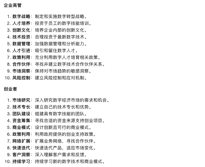 - 创业者:利用政策支持,积极创业并寻求数字人才的支持。