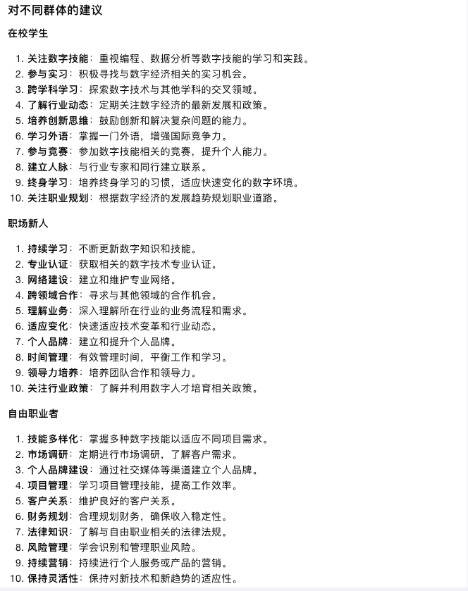 | 在校学生 | 1. 选择与数字经济相关的专业。2. 积极参加实践活动,提高实际操作能力。3. 关注行业动态,不断学习新知识。4. 参加数字技能培训课程。5. 考取相关证书,增加竞争力。6. 参与创新创业项目,培养创新能力。7. 建立人际关系网络,与同行交流经验。8. 提高英语水平,便于国际交流。9. 锻炼团队合作能力,适应职场需求。10. 培养解决问题的能力,提高综合素质。 |