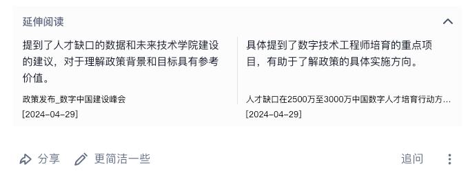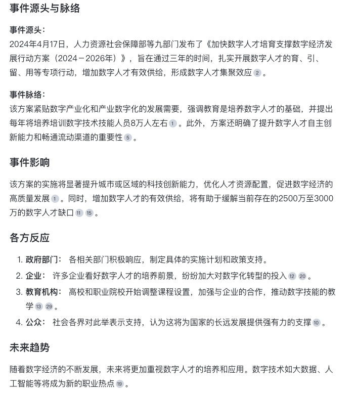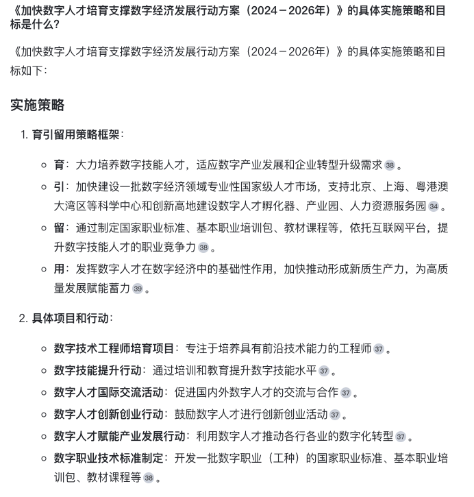 - 根据人民网,人社部等九部门印发了《加快数字人才培育支撑数字经济发展行动方案(2024-2026年)》,旨在3年内通过专项行动增加数字人才有效供给,形成集聚效应。