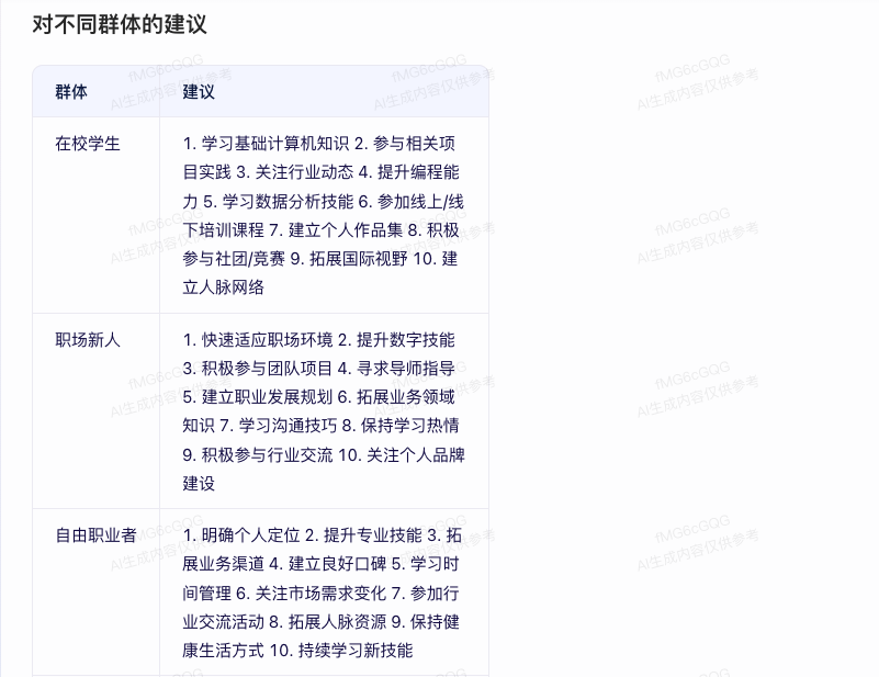 | 在校学生 | 参加数字技能培训课程 | 关注行业动态,了解市场需求 | 参与实践项目,积累经验 | 建立个人品牌,展示技能 | 参加相关竞赛,提升能力 | 加入专业社群,拓展人脉 | 寻找实习机会,提前适应职场 | 学习跨学科知识,增强综合能力 | 制定职业规划,明确发展方向 | 保持好奇心和学习态度,不断进步 |