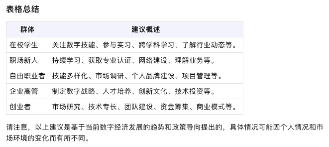 | 自由职业者 | 1. 提升自身数字技能,满足市场需求。2. 建立个人品牌,提高知名度。3. 拓展客户资源,扩大业务范围。4. 关注行业动态,及时调整业务方向。5. 与其他自由职业者合作,共同完成项目。6. 提高自我管理能力,保证工作效率。7. 加强知识产权保护意识。8. 提供优质服务,树立良好口碑。9. 利用社交媒体平台,宣传自己的业务。10. 不断学习新知识,保持竞争力。 |