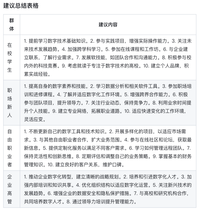 - 对在校学生:提供更多的数字技能培训机会,增加就业竞争力。