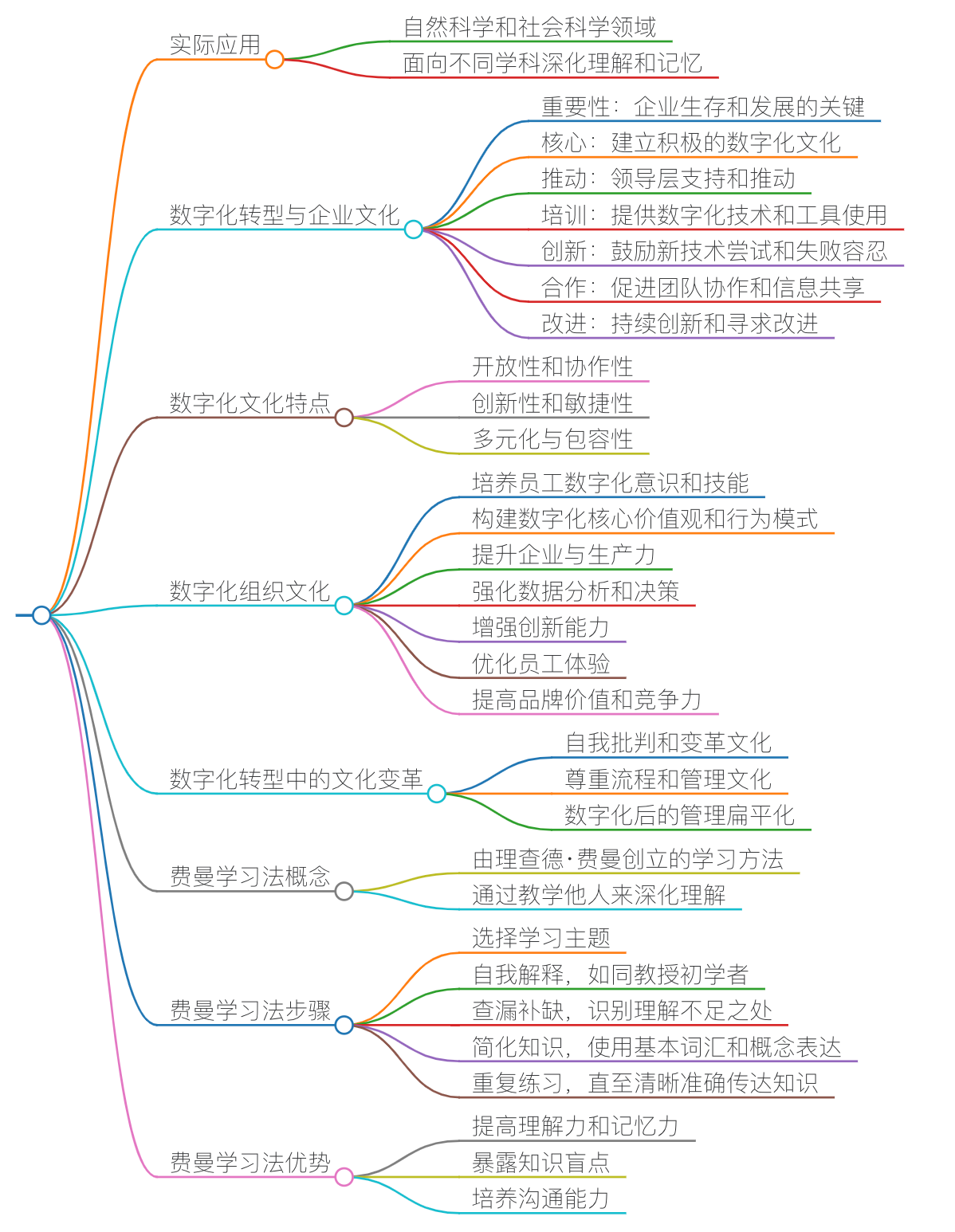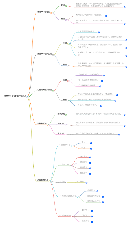 使用费曼学习法的步骤进行介绍;先说明费曼学习法的概念、知识点及优势等;阅读的对象主要是职场新人,使用他们容易理解的场景案例通俗易懂地解释费曼学习法,并举例说明要怎么应用,要具体展开对每一个步骤进行完整模拟;假设3个他们可能提出的疑问、困惑或者挑战性问题;进一步查找相关资料解答上述问题,以加深对费曼学习法的理解;最后进行归纳简化,输出费曼学习法的思维导图大纲;通过这篇文章的宣导,你预期对你后续推动数字文化、创新文化、变更文化会有什么帮助或影响。