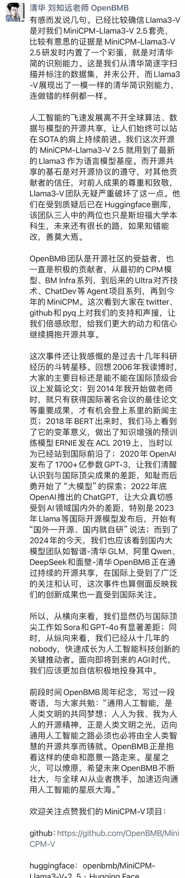 - 2024年06月03日,面壁智能首席科学家、清华大学长聘副教授刘知远在知乎平台回应称: